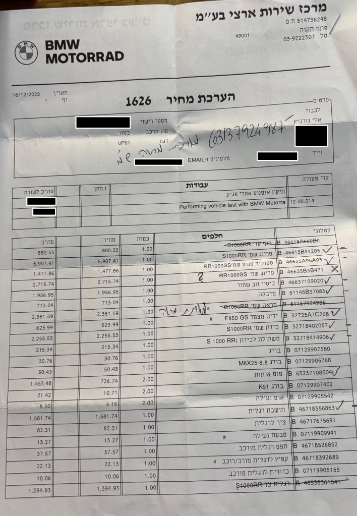 I went to see Edi again and we marked all the essential parts on the price quote – these are all the markings you see on the page. I considered buying parts in Germany, which would have cost half the listed price. But then I decided that I had enough riding with a bent handlebar and a friend introduced me to Victor – a master car body repairman. So I fixed the handlebar at the Service Center and paid the full price. Then, for all the scratched metal and broken plastic parts I went to Victor (I’ll give his contact details privately to anyone who needs help). He took the motorcycle for 3 days and returned it fixed almost as new. All in all, the fix cost 7000 NIS ($2180) and my beloved bike returned to its beautiful self. The only thing missing is the sticker with the S1000 RR logo which costs 713 NIS and I didn’t buy it for now.