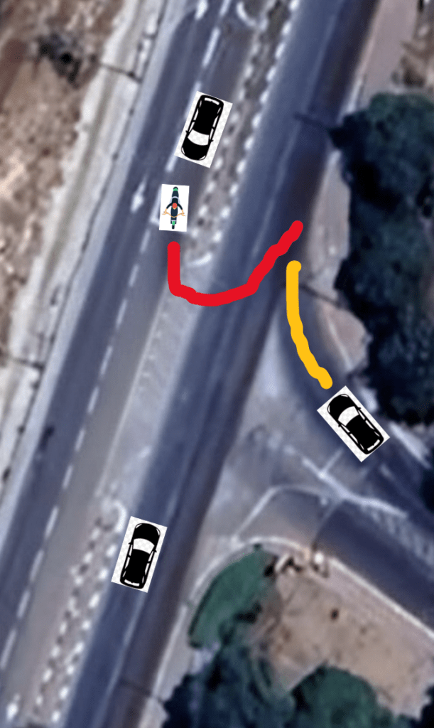 The accident happened at the intersection below, where I took a U-turn, the driver in the car on the left didn’t notice me (he said he was looking to the left) and he hit me from behind.
