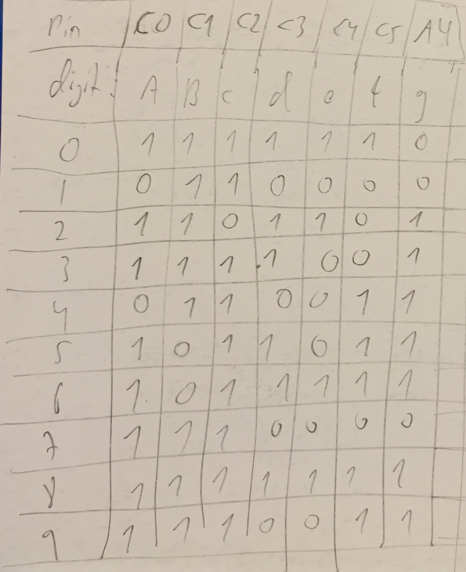 // pin to segment assignment is: // C0-C1-C2-C3-C4-C5-A4 // A -B -C -D -E -F -G // Pin A2 used for ADC // Pin A0 used for display pin 8 – digit 1 – ones // Pin A1 used for display pin 9 – digit 2 – tens