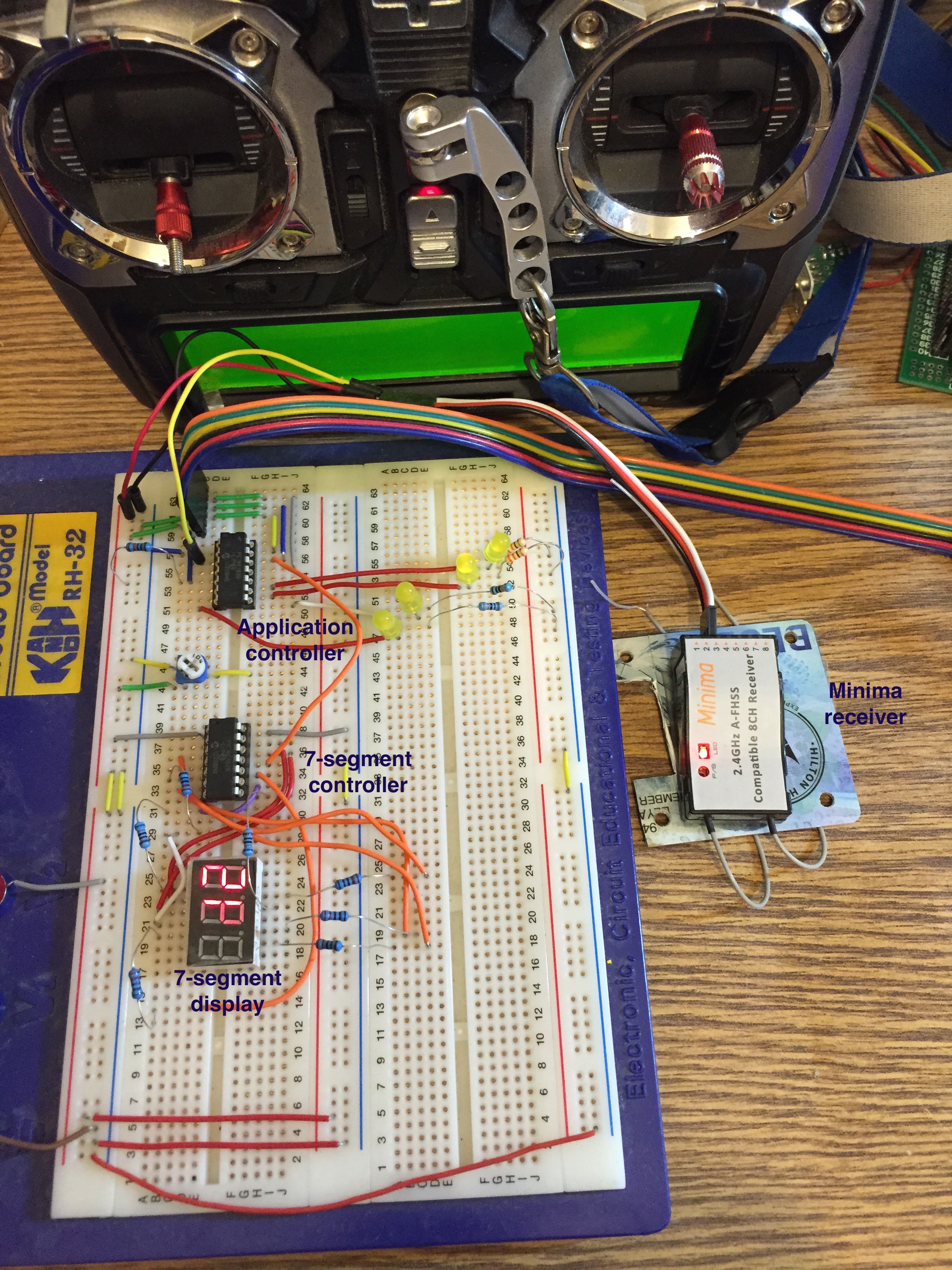 I decided to connect my cheap Minima receiver to the circuit and write a small program to display the PWM value, that I’lll transmit to it, on my 3-digit, 7-segment display. The Minima is sold by Hobbyking.com here. It is compatible with my Hitec transmitter and the price is just 19.73 euros, which is cheap compared to the original Hitec Optima receiver.
