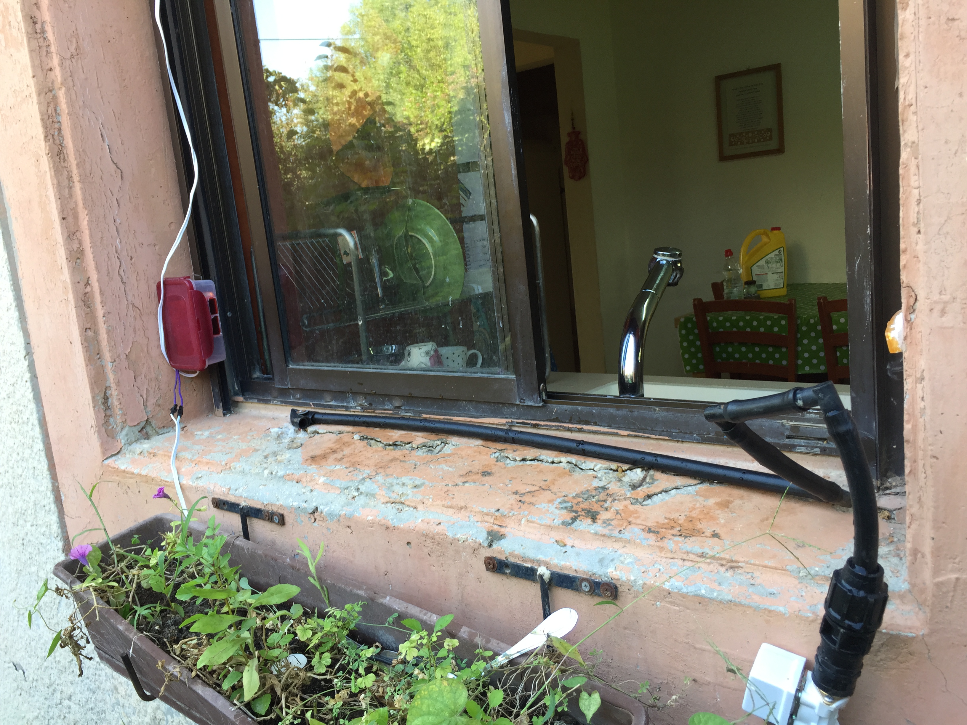 Some time passed until I decided to finally connect the water pipes to my automatic irrigation system. I did that only when I discovered a small hole in one of the main pipes and had to take it apart and replace that section of the pipe. So I added a T-shaped connector and drew a line towards the window.