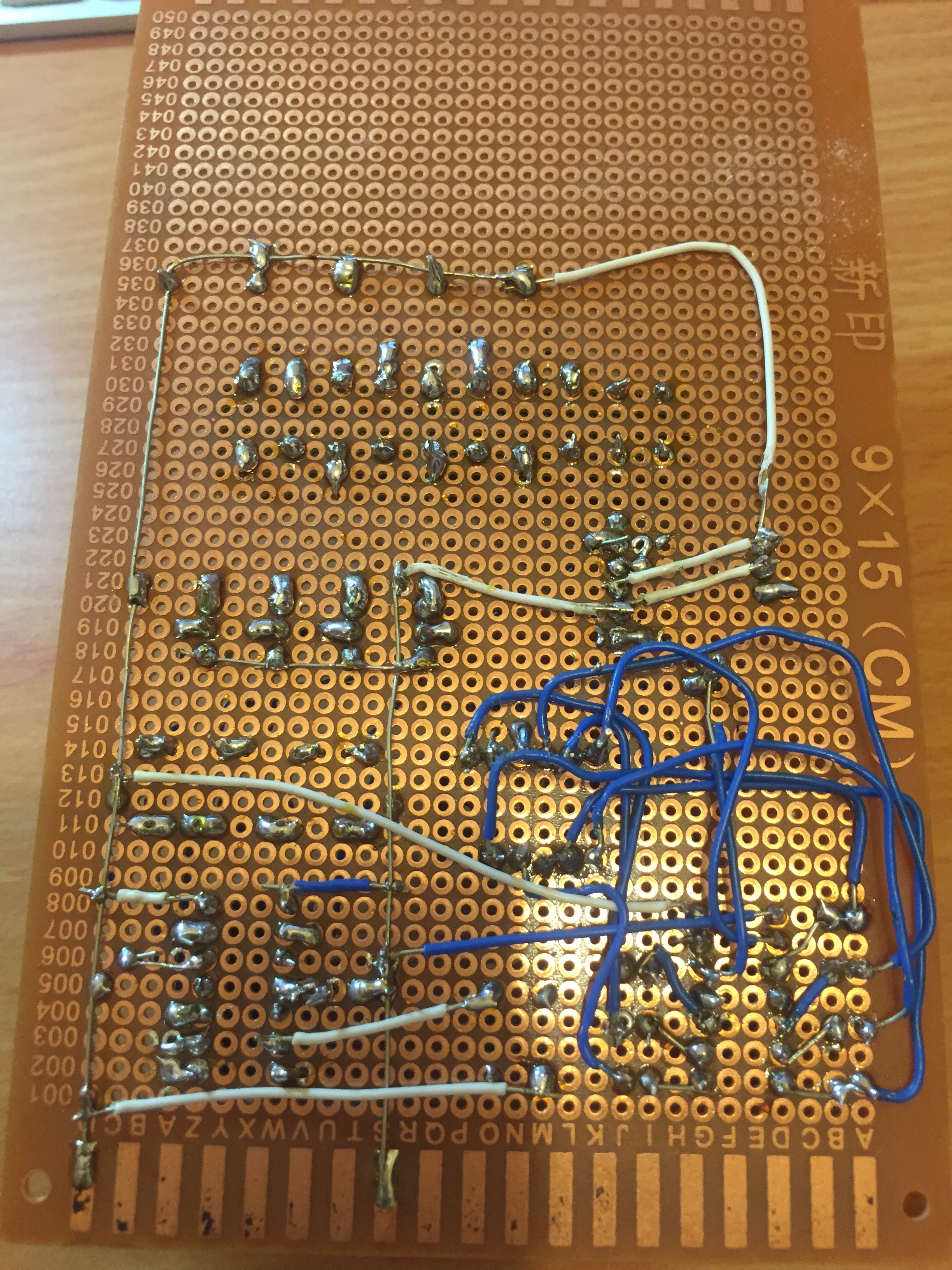 The time has arrived to move the LED controller circuit from the bread board to a real board. It was to be my first experience with relatively delicate soldering of quite a few connections. I stuck the few components onto the board and started soldering the underside.