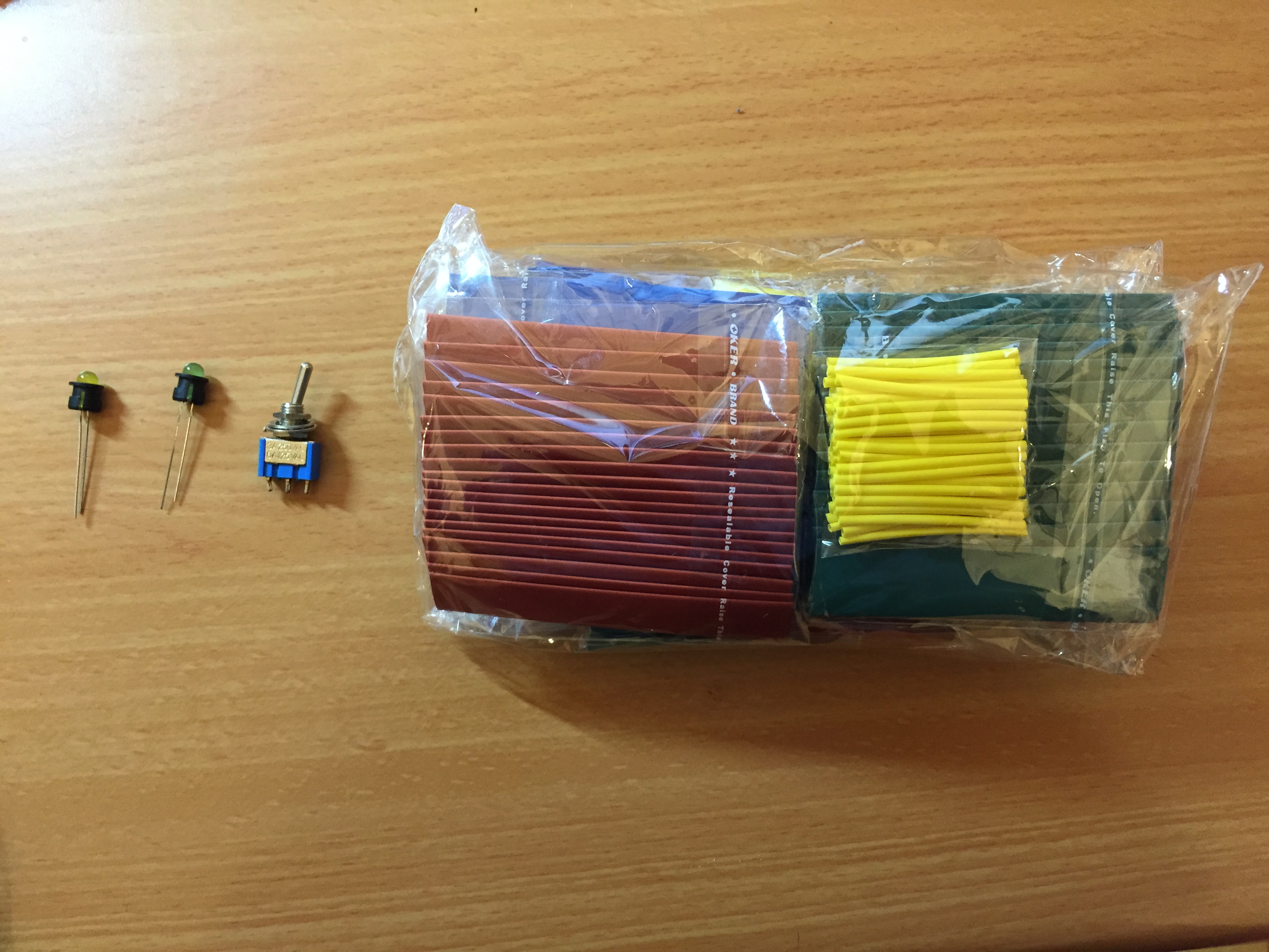 I also used some stuff that I had at home: LEDs, a SPDT switch and some heat shrink.