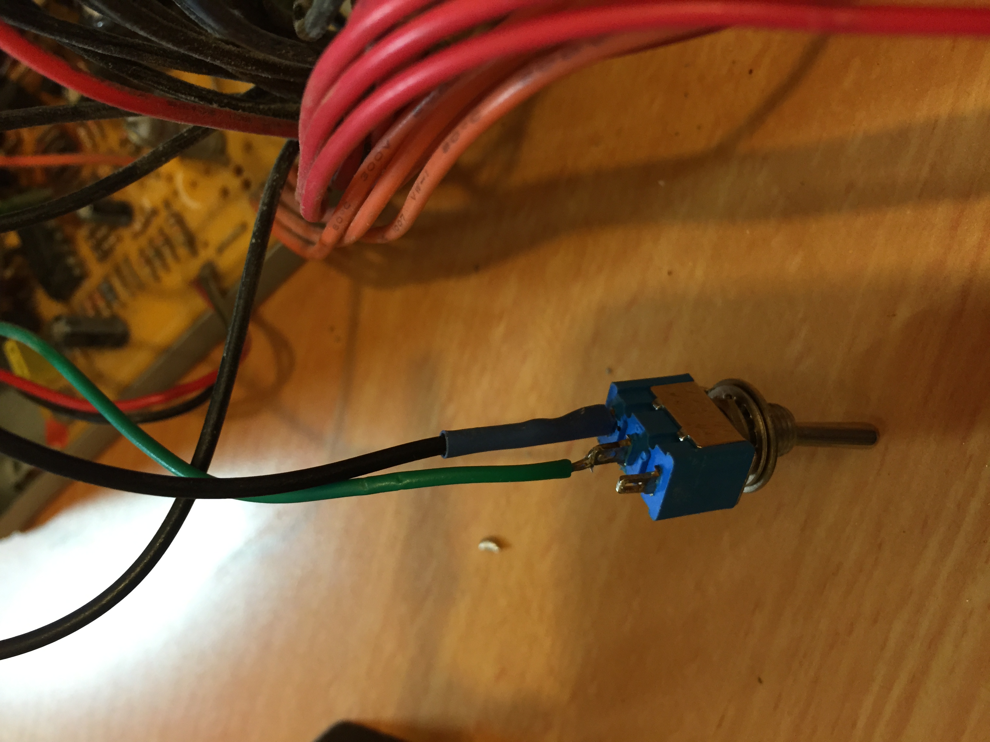 I connected the switch between the green line (Power on) and one of the black (ground) lines.