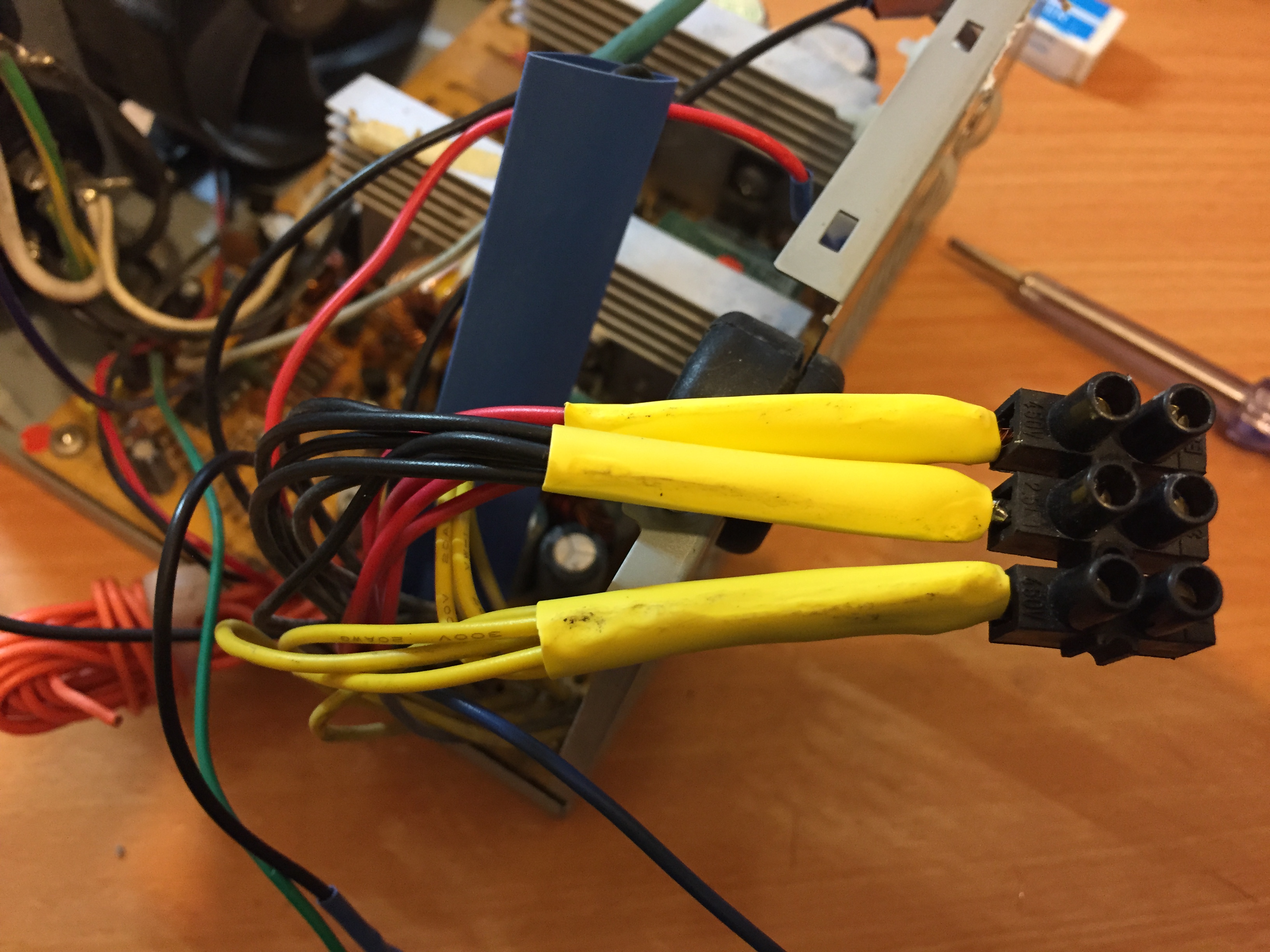 The I grouped the lines by color – black (ground) , red (+5V) and yellow (+12V). I folded the orange lines (+3.3V) and secured them with a cable tie. I connected the black, red and yellow cables together and into a connector.