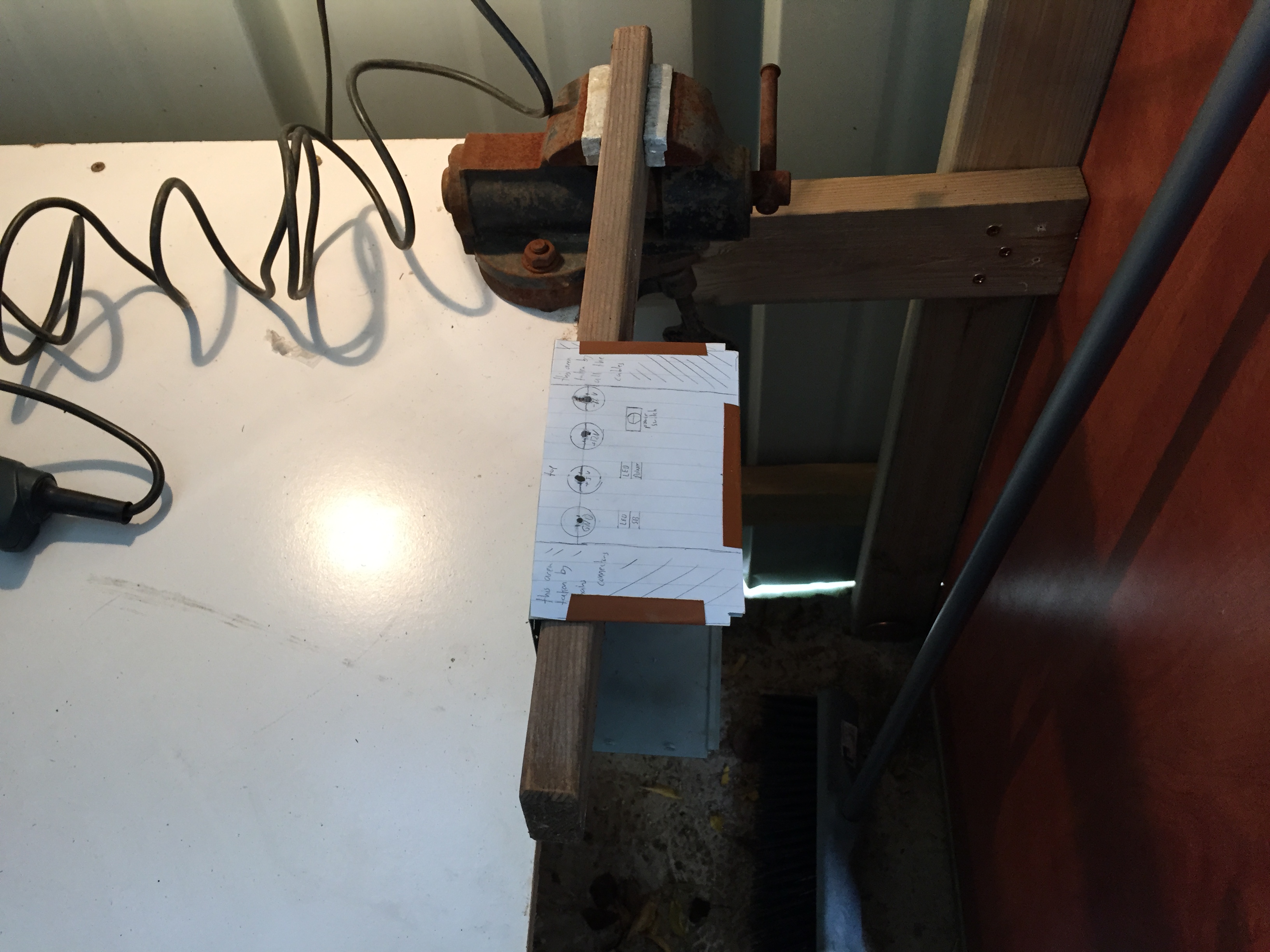 The next challenge was to drill the holes in the cover. I tried various drill bits and various ways to hold the cover in place until I finally found this to work – holding a piece of wood in the clamp, placing the power supply cover over it and drilling with my power drill.
