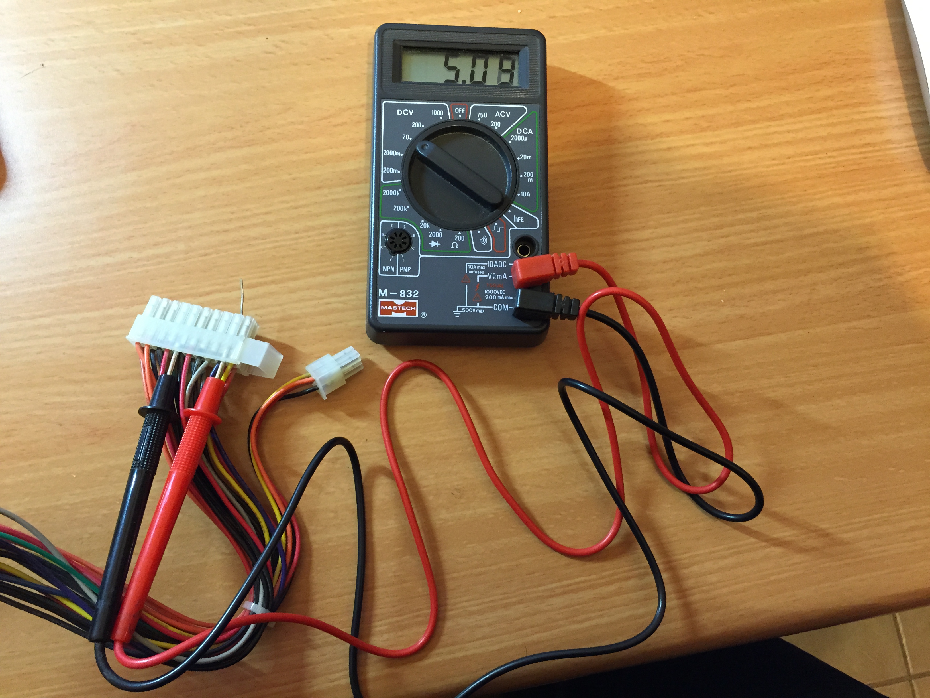 The first step is to test if the power supply works at all. One possible method is to test if it outputs a standby voltage (called +5VSB). This signal is used by a PC motherboard for functions such as “wake up on LAN” and other stuff it has to do when the PC is turned off. The standby cable is purple, so if I measure the voltage between the purple cable and one of the black cables I should see 5V. As you can see in the next photo, the power supply seems to be ok.